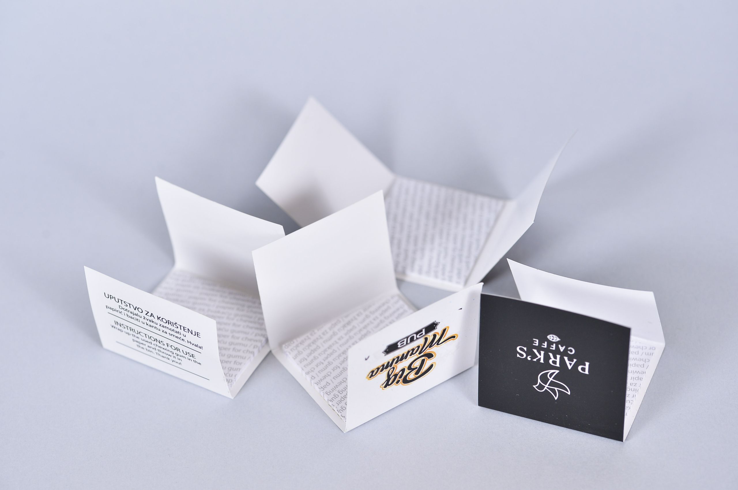 Papirići za žvakeArtiklPakiranjePAPIRIĆI ZA ŽVAKE10 listića / 1 kom.1000 kom.* Minimalna količina za tisak logotipa: 1.000 kom.* Mogućnost tiska full color